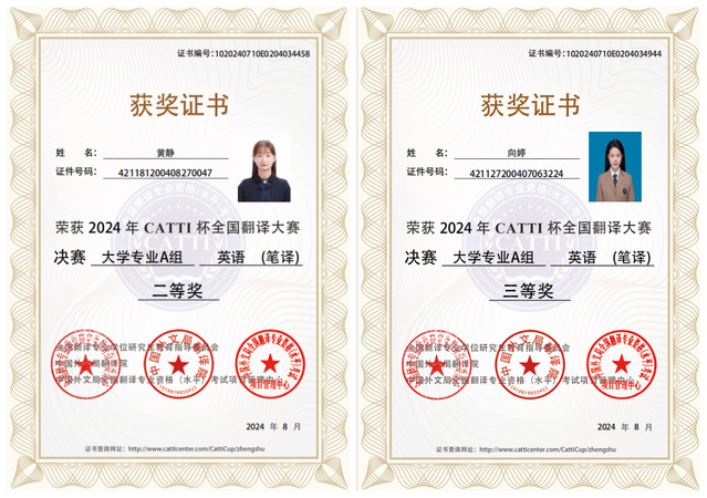 【本网讯】(通讯员 周俊博)近日,2024年CATTI杯全国翻译大赛决赛获奖名单公布。太阳成集团tyc539翻译2241班黄静同学荣获大学专业A组中英(笔译)二等奖,英语2242班向婷同学荣获大学专业A组中英(笔译)三等奖。