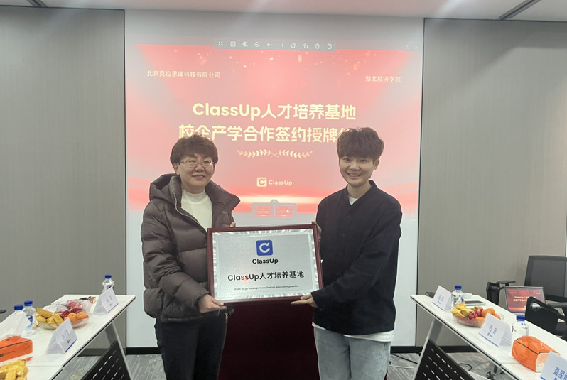 双方随后举行了人才培养基地校企产学合作签约授牌仪式,并对ClassUp公司业务、国外教培市场现状以及英语专业人才培养方向进行了深入交流。