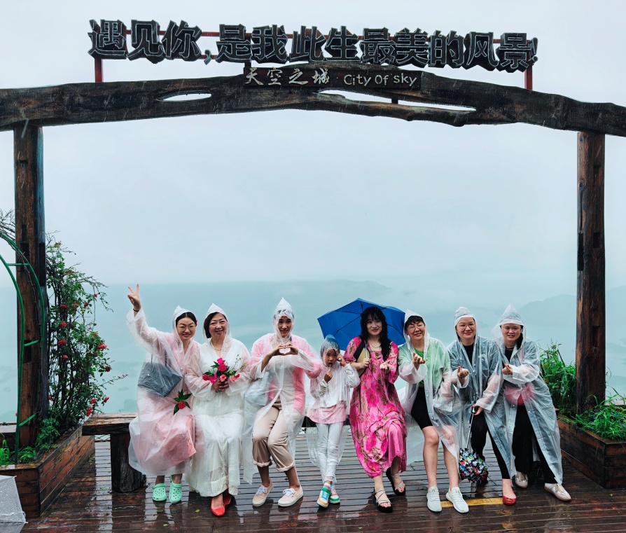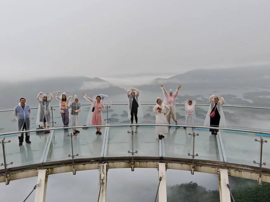 行程的亮点在于“天空之境”观景平台。立于此处,云雾时而聚散,脚下湖光山色若隐若现,宛如置身云端。许多老师纷纷驻足,用手机记录下这如梦似幻的景致。有人笑言,这濛濛细雨反而成就了“天空之境”最贴切的意境——天与云与山与水,浑然一体。